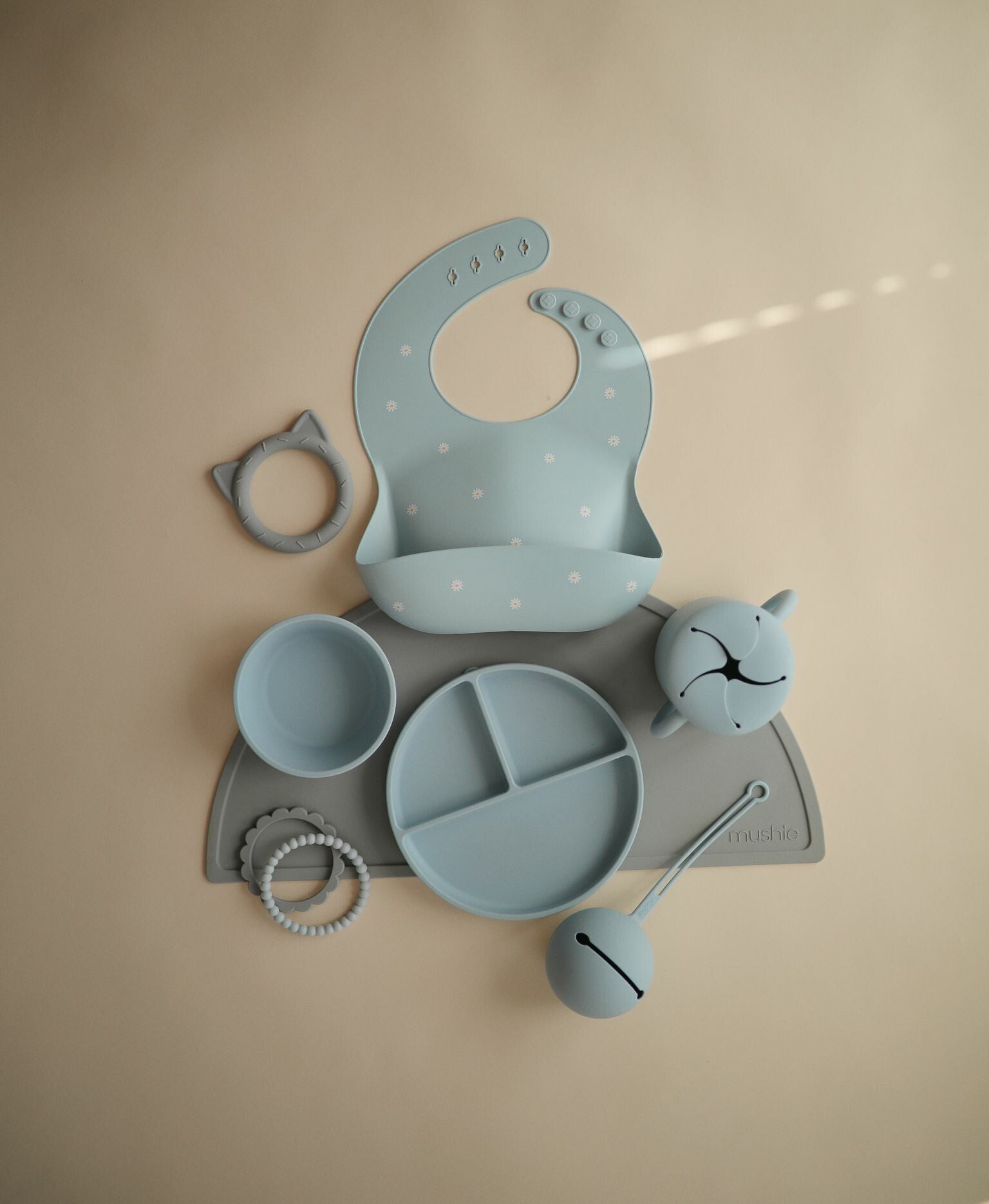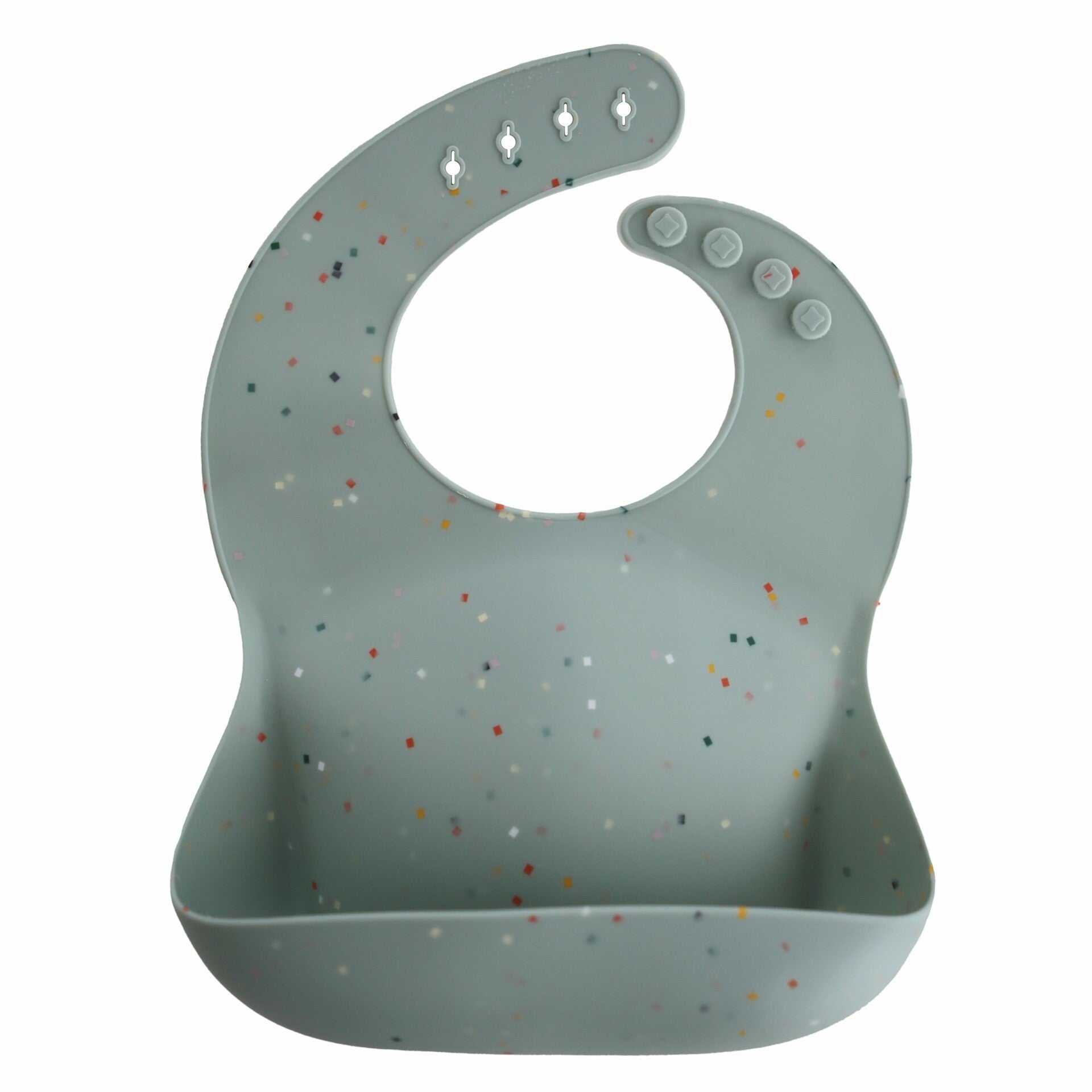 De flexibele siliconen slabbetjes van Mushie zijn ontzettend handig. Makkelijk vast te maken in de nek van je mini en dankzij de vier knoopjes kun je hem in maat verstellen.