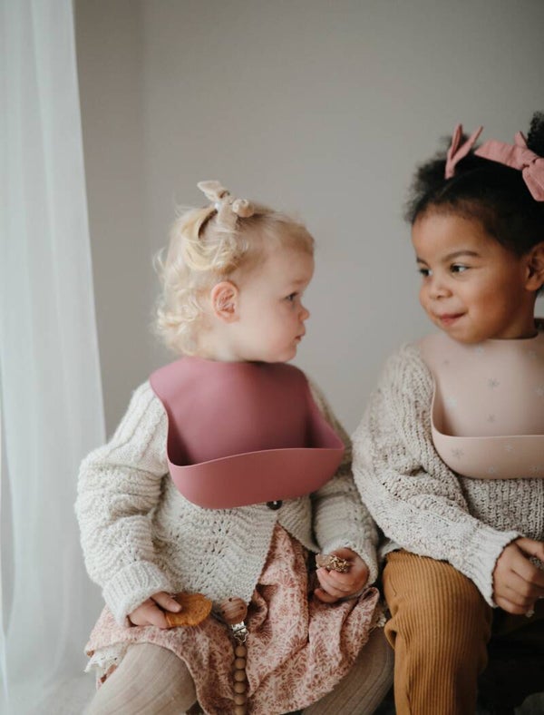De flexibele siliconen slabbetjes van Mushie zijn ontzettend handig. Makkelijk vast te maken in de nek van je mini en dankzij de vier knoopjes kun je hem in maat verstellen.