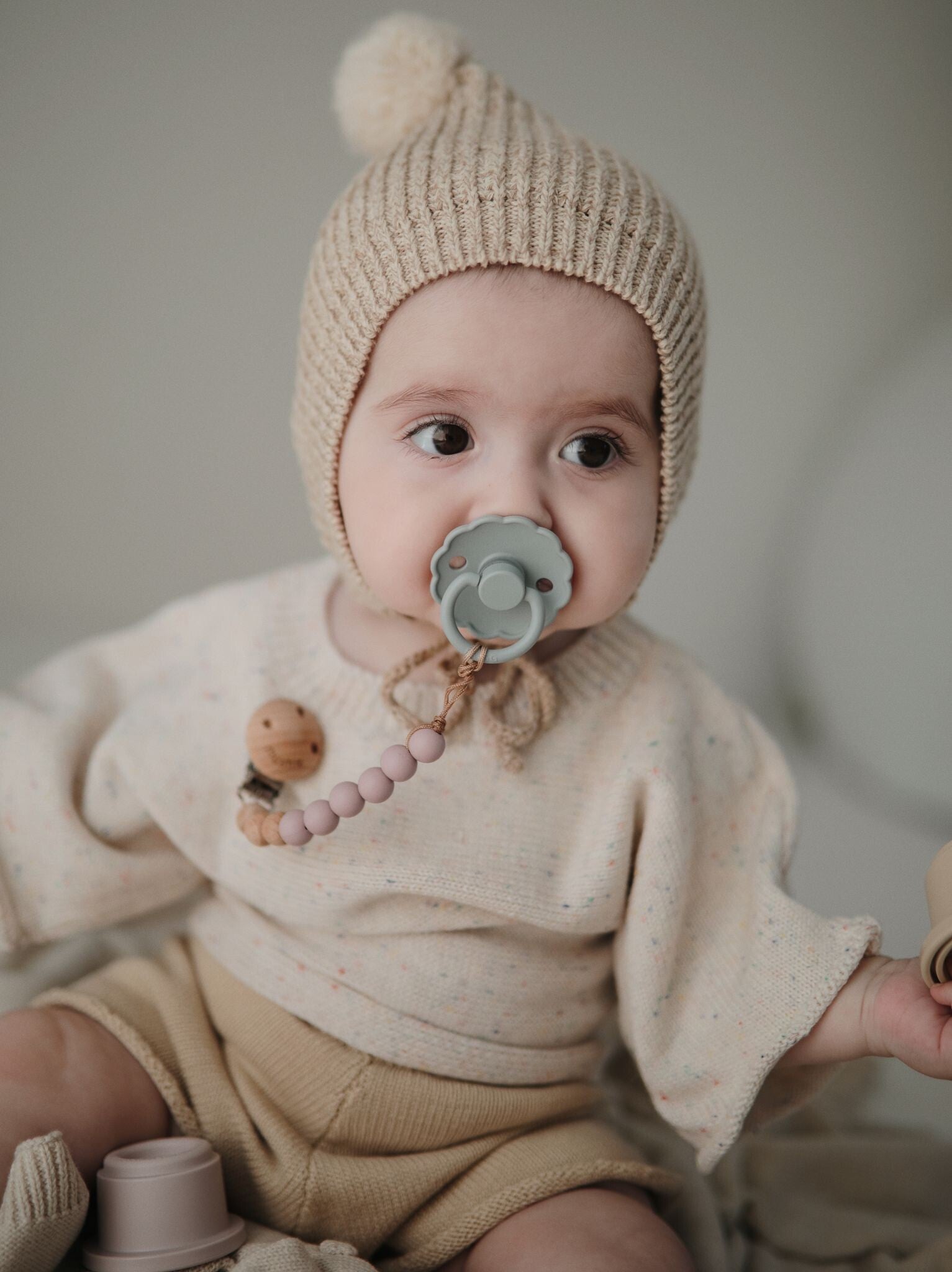 Met de speenkoorden van Mushie raak je de fopspeen nooit meer kwijt! Door middel van de clip maak je hem gemakkelijk vast aan de kleertjes van de mini.