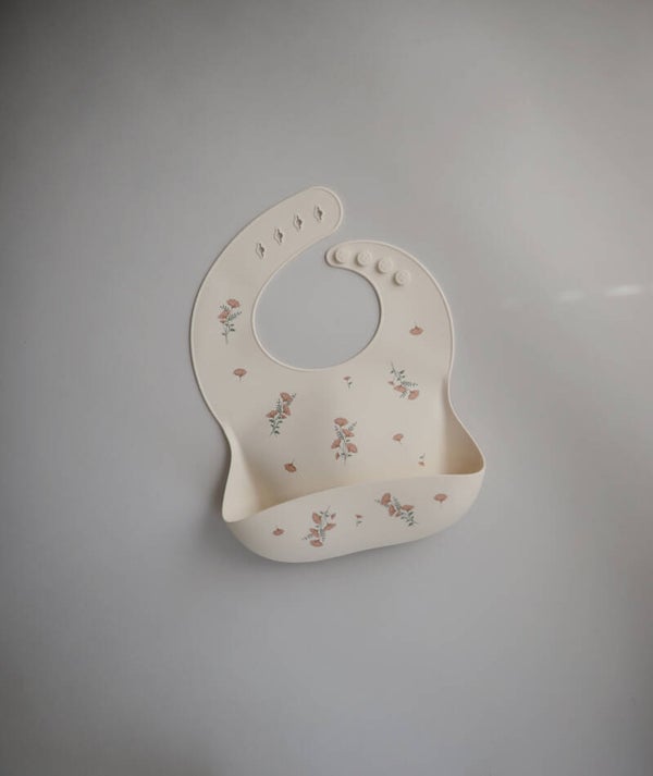 De flexibele siliconen slabbetjes van Mushie zijn ontzettend handig. Makkelijk vast te maken in de nek van je mini en dankzij de vier knoopjes kun je hem in maat verstellen.